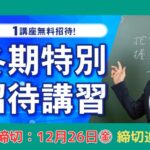- 【本日まで】冬期特別招待講習 受付最終日です冬期特別招待講習の申込受付は本日最終日となっております。参加ご希望の方はお早目にお申込みをお願いいたします。 … 続きを読む: 【本日まで】冬期特別招待講習 受付最終日です